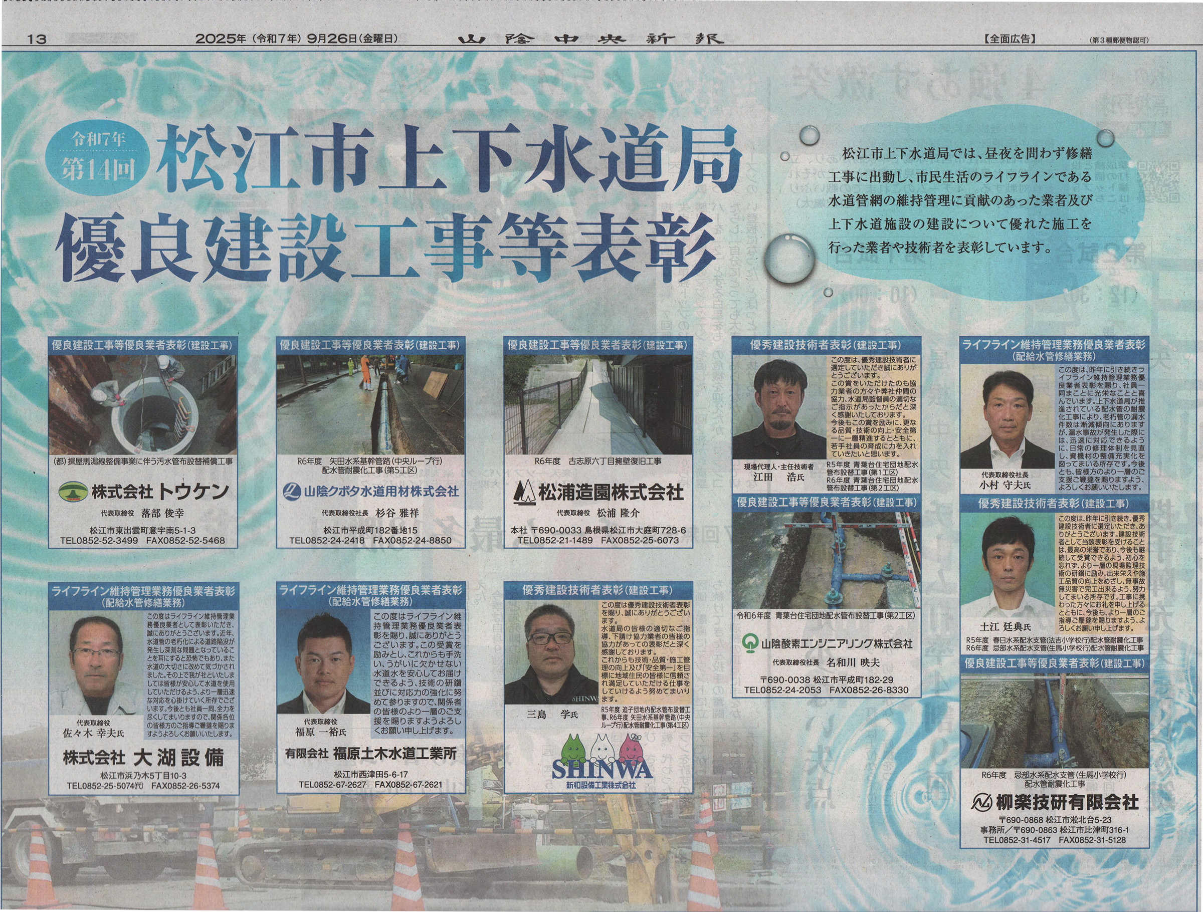 山陰中央新報 2025年9月26日掲載 (有)福原土木水道工業所