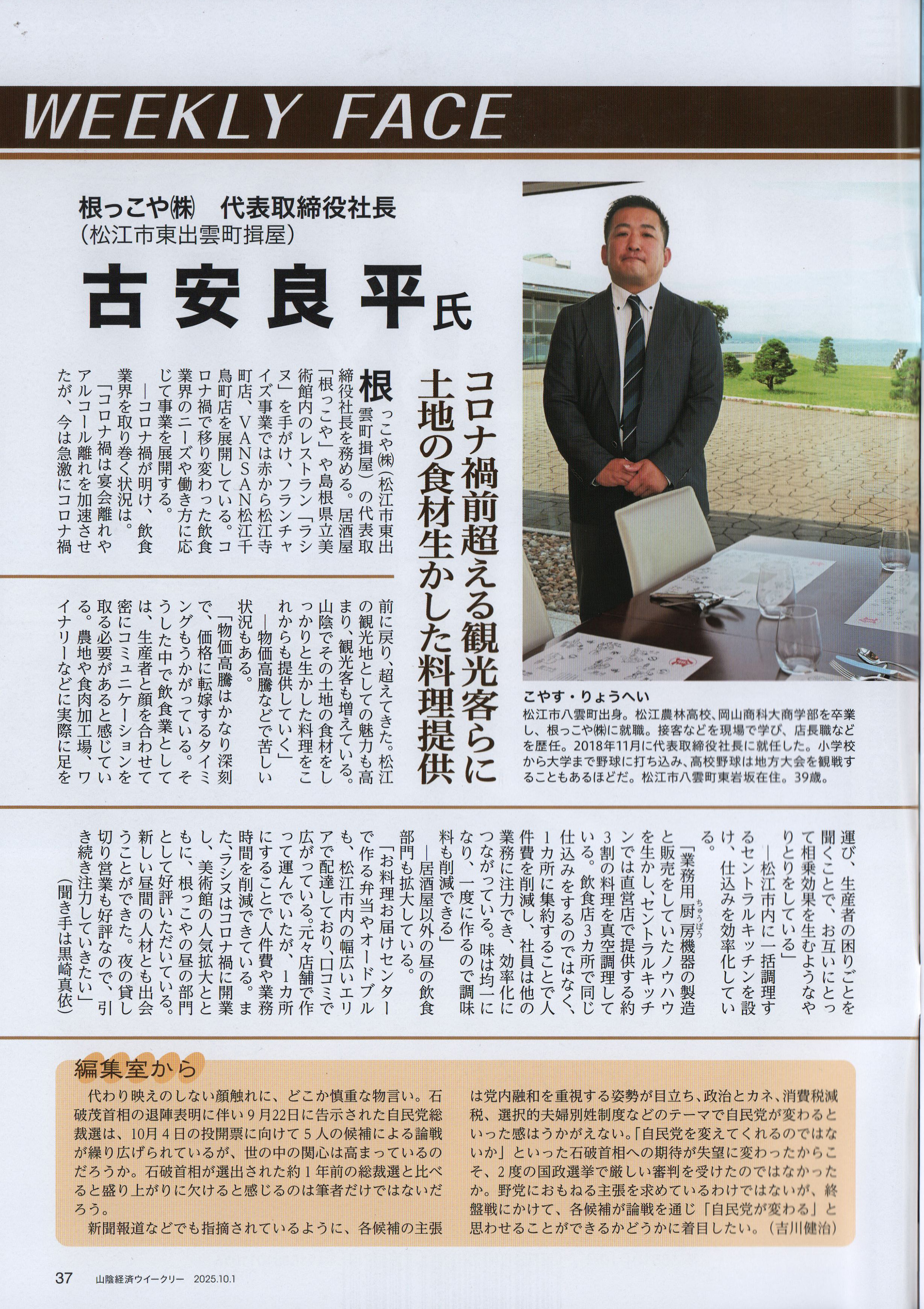 山陰経済ウィークリー 2025年10月1日号掲載 根っこや(株)