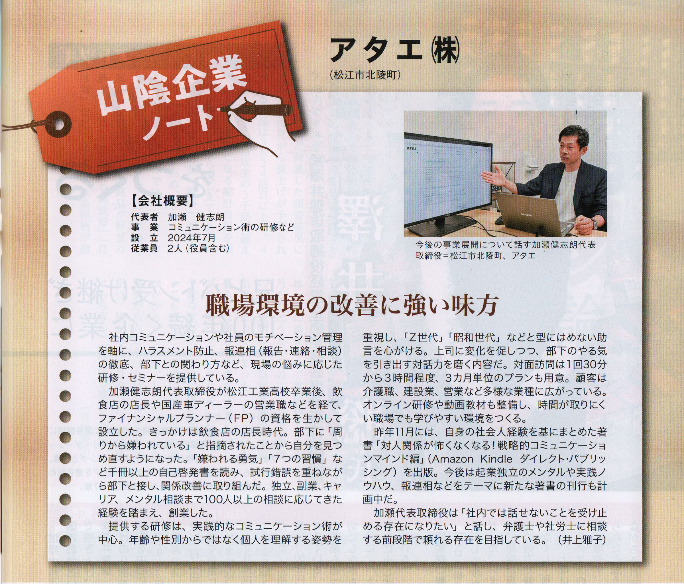 山陰経済ウィークリー 202510月7日号掲載 アタエ(株)